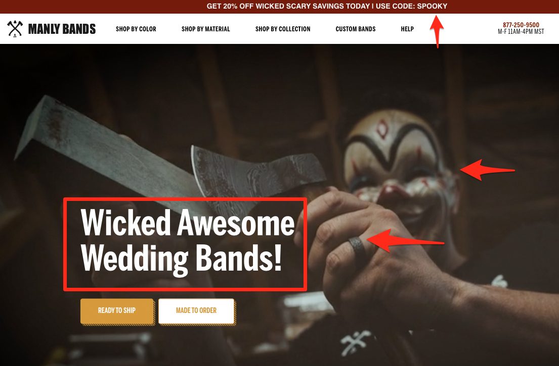 The Halloween-themed call-to-action — Wicked Awesome Wedding Bands — and “Spooky” discount code nudge them even closer to making a purchase.