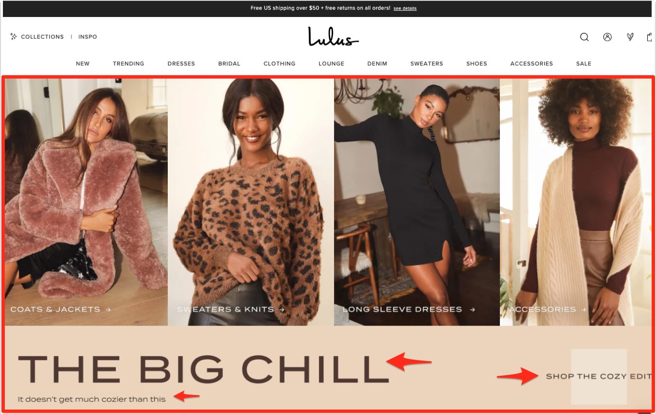 Women’s clothing brand LuLus features their Big Chill collection right on the homepage, with captivating copy: “It doesn’t get much cozier than this:”