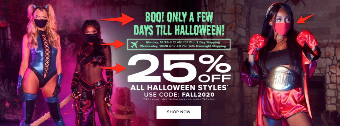 The banner image above from their homepage starts with a CTA created to build a sense of urgency: “Boo! Only a Few Days Till Halloween.” Underneath, browsers have a list of shipping deadlines to ensure their last-minute costume purchase arrives before Halloween. There’s an on-theme 25% discount code (FALL2020) to entice browsers further.
