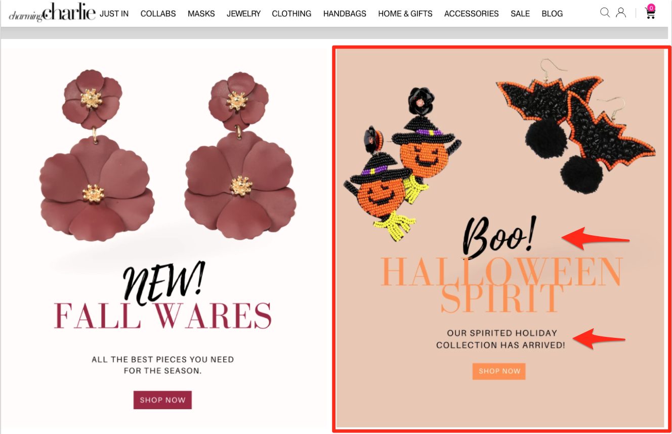 The brand combines images of fall-themed jewelry with Halloween-specific picks like pumpkin witch and bat earrings. Charming Charlie updated their standard font to reflect holiday-themed colors yet formatted their CTAs the same: with an attention-seeking call-out and a brief description.