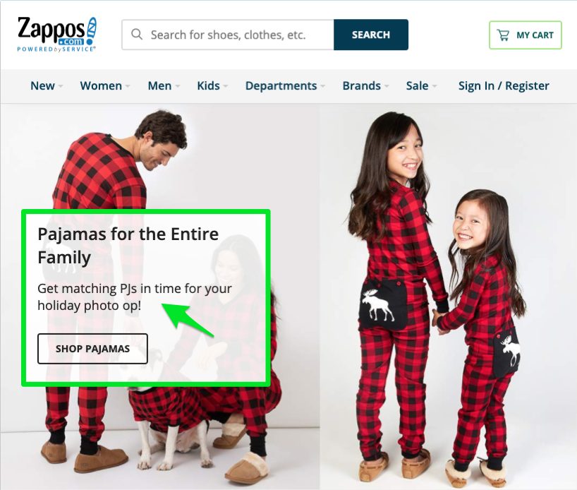 Online shoe and clothing brand Zappos takes a page out of Old Navy’s book by offering shoppers matching holiday PJs for the whole family. Their messaging even reminds browsers to order early “in time for your holiday photo op.”