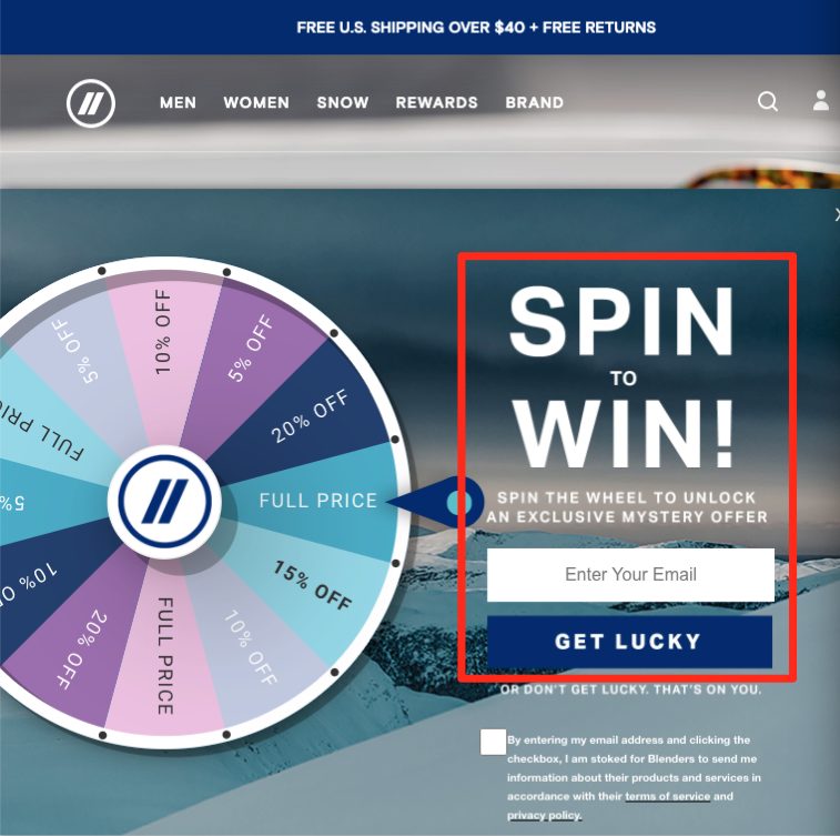 Another popular polarized sunglasses brand, Blenders Eyewear, also has a Vegas-style spinner tool that greets new customers and rewards them if they enter their email address: