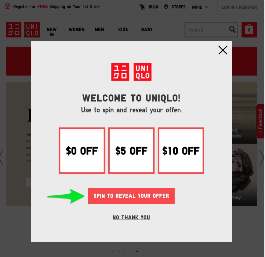 Japanese-born clothing brand UNIQLO (which translates to “unique clothing”) added a fun feature to their website that lets new visitors spin for a special discount offer: