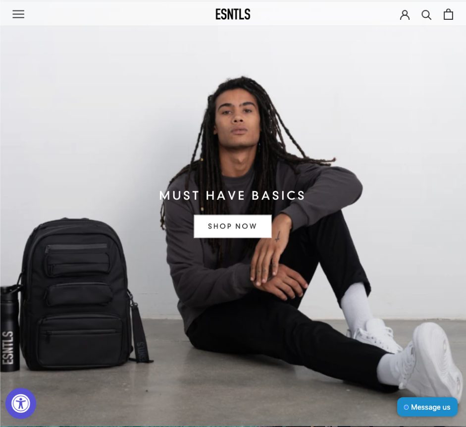 Men’s clothing line ESNTLS doesn’t sell anything edgy or out there; it leans towards sophisticated, timeless basics. To capture this aesthetic, they opt for clean, modern website design: