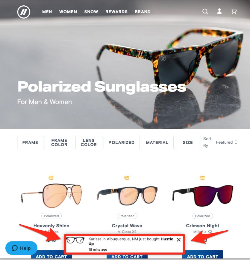 This is another example of social proof being used to help on-the-fence customers convert. Once they keep seeing other customers making purchases and taking items off the proverbial shelves, they’ll feel more comfortable and inclined to do so too.