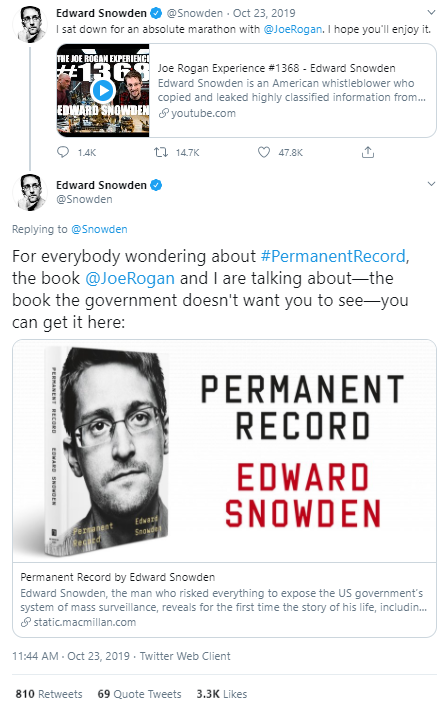 A good model to look at comes from when Edward Snowden appeared on The Joe Rogan Experience a podcast where Joe Rogan interviews various influential people- to talk about his book, Permanent Record. Snowden sent out promotional tweets after the appearance that were to the point but effective: