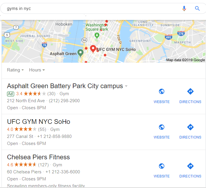 Once they click search, they’ll see this list of gyms on their screen. Without a Google Business account, you’re missing out on customer who could have called, visited your website, or visited your gym to sign up.
