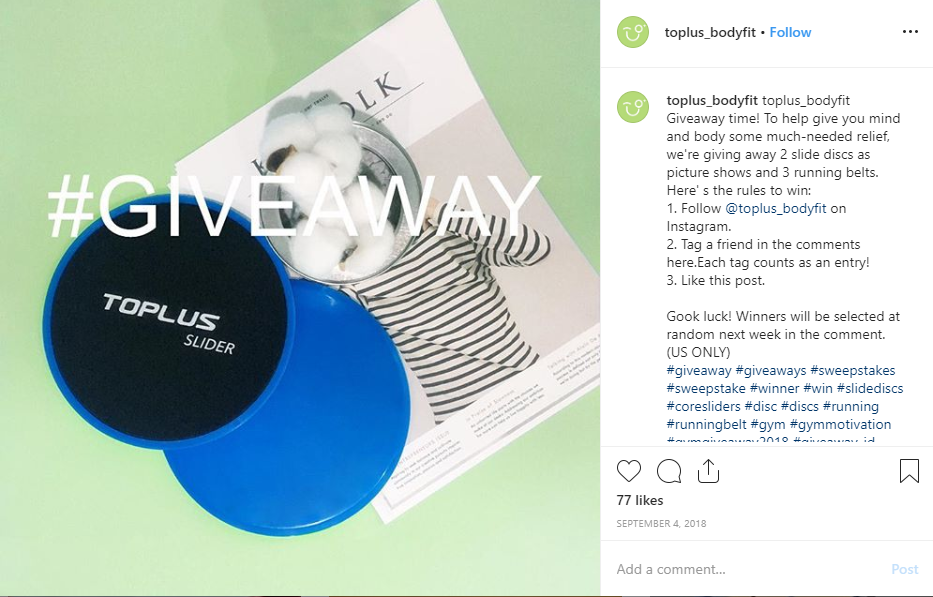 Sharing and hosting a contest on social media is also one of the best ways to grow your followers by making following your account a requirement to enter. That’s what Toplus Body Fit did on Instagram: