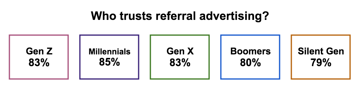 The best thing is, referral marketing is trusted across all age groups. A Nielsen survey found that the majority of each age group trusted referral marketing more when compared to digital and traditional marketing techniques: