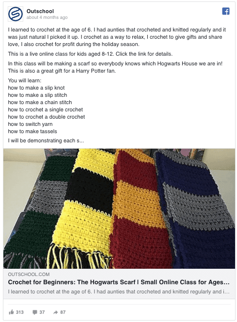 - Broad appeal: Consider the most appealing element of your product promotion, as the advertiser has done here. A course in which you made a scarf probably wouldn’t sell that well. Making a Hogwarts scarf before the holidays? Boom, whole different value proposition.