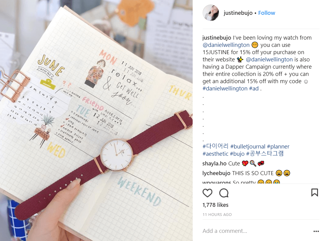 They also gift their micro-influencers free watches and ask them to promote them on social media using the branded hashtags. Most of them also share a unique discount code for their followers. This helps grab more eyeballs, and in effect, increase conversions.