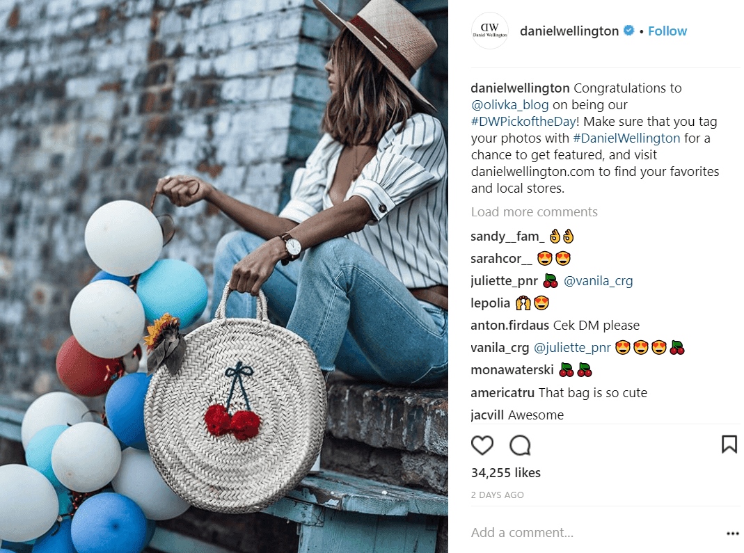 Watchmaker, Daniel Wellington, has been using this strategy and been extremely successful with it too. On one hand, they encourage their followers to post their photos of Daniel Wellington watches using their branded hashtags.