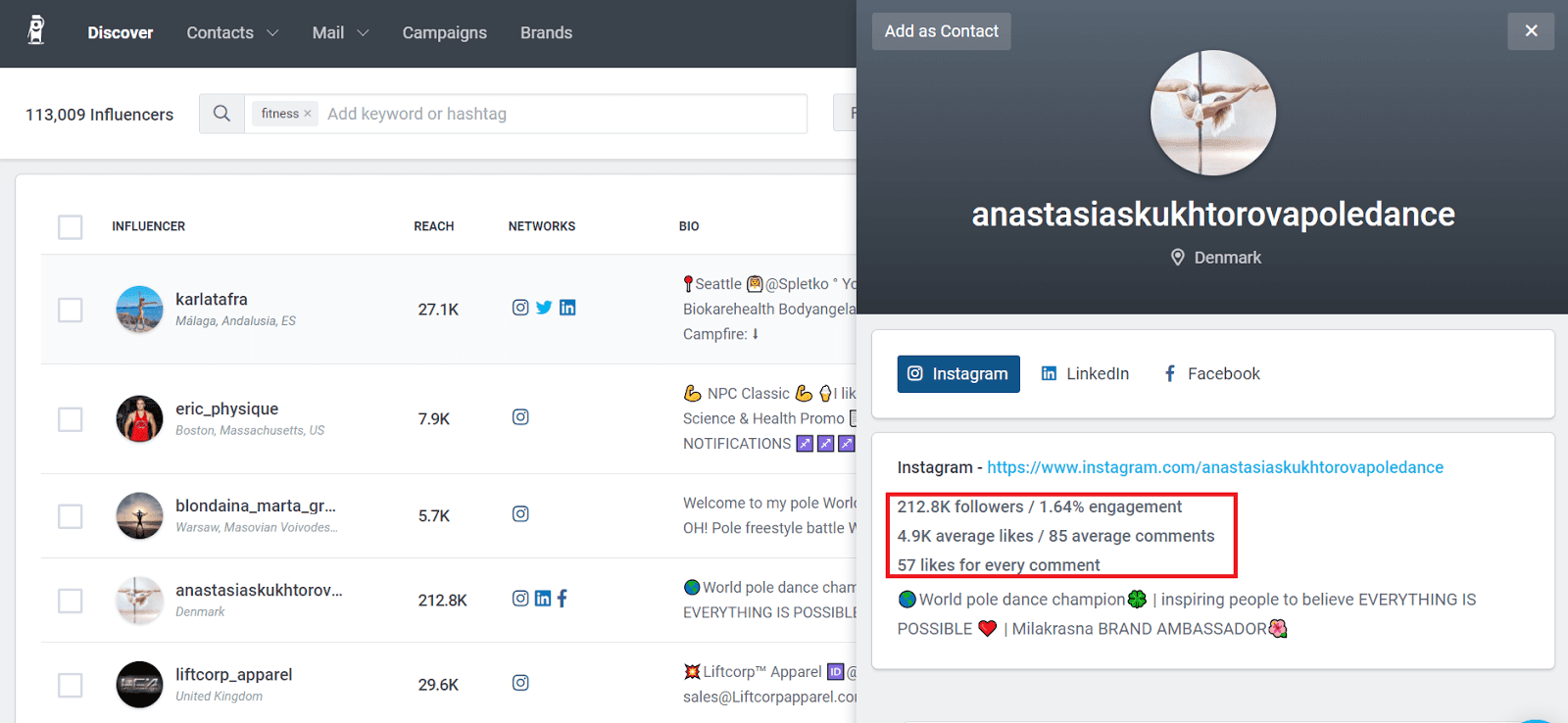 It allows you to search and filter by category, social platforms, reach, or engagement rates.
