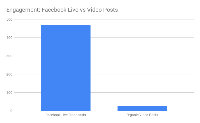 Engagement is where Facebook Live really blew our video posts out of the water. Our live broadcasts garnered 469 engagements. At the other end of the spectrum, our video posts got a measly 28 engagements.