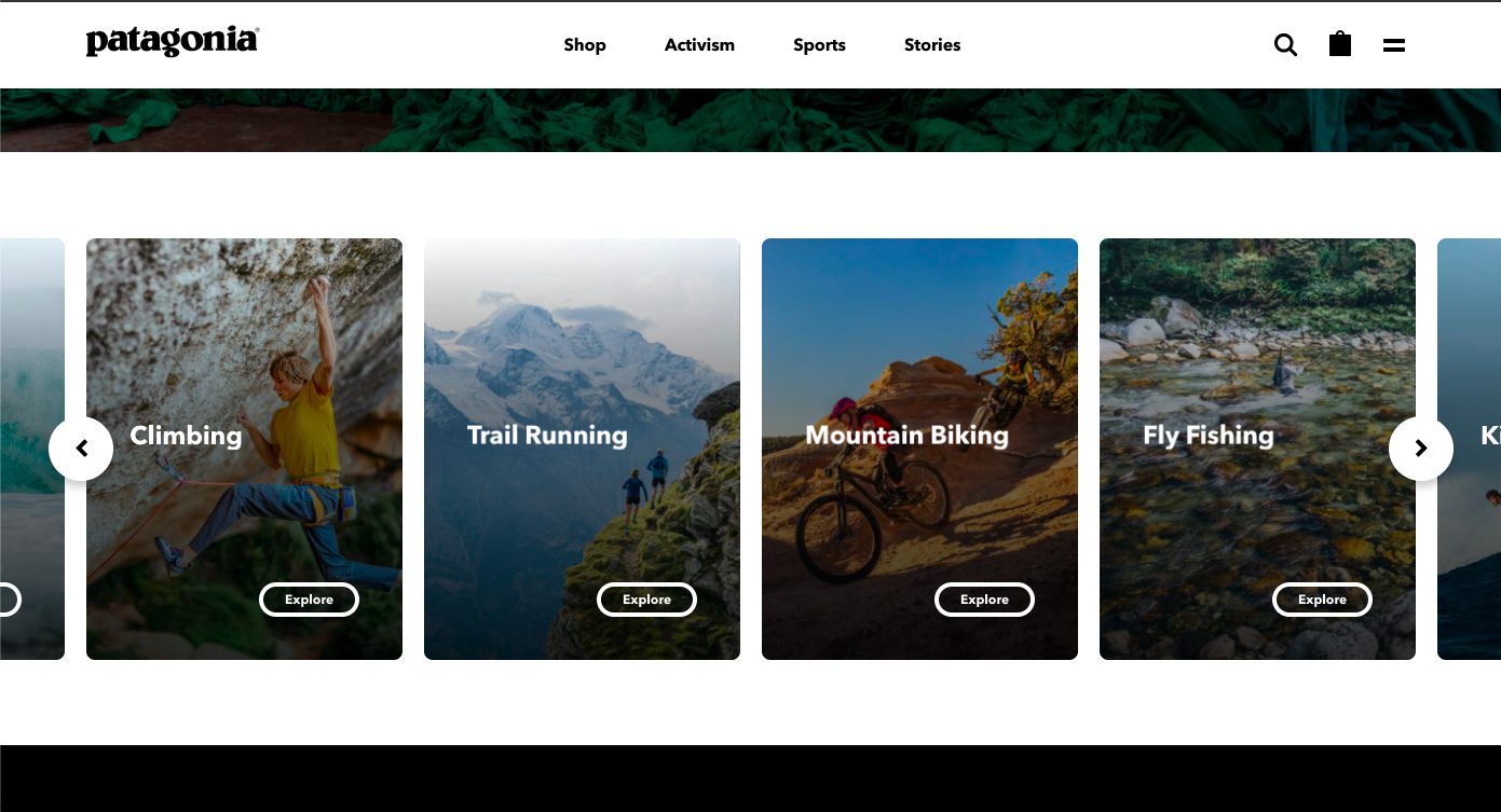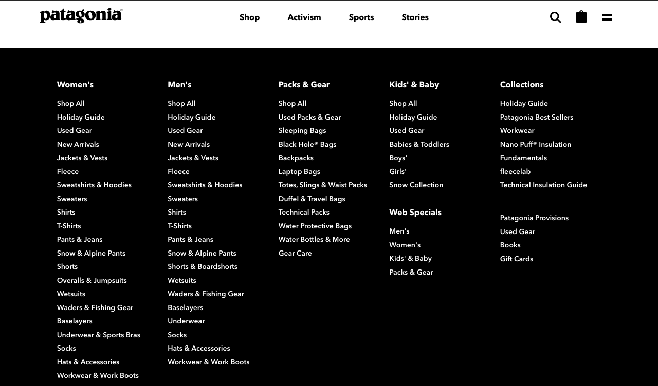 One website that does this well is Patagonia. Not only do they have their navigation set up to section out genders, ages and desired clothing, as seen above. They also section out their website based on the activities their visitors partake in. You can see how they do that below.