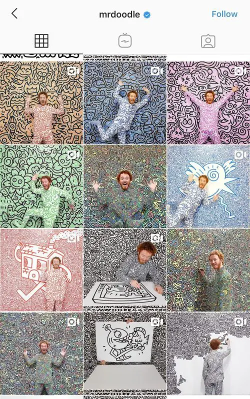 On the other end of the spectrum, there’s Mr. Doodle’s series: he’s great at doing clear, high quality, similar themed posts. While his doodles could seem repetitive if he kept posting the same thing, he’s great at mixing it up by changing the angle or focus of his posts but keeping the overall feel of his account pleasing, playful and cohesive by maintaining a theme for a limited period, then moving on.