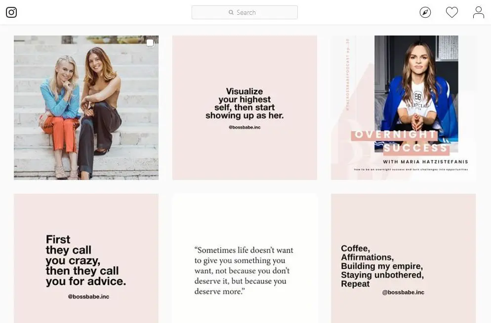 For two examples, check out how Boss Babe Inc, a motivational brand for women, alternates between pink and white squares for a checkerboard effect, which is a highly effective aesthetic, and a great tactic for brands which may not have a lot of photo content, but want to keep up a consistent posting schedule.
