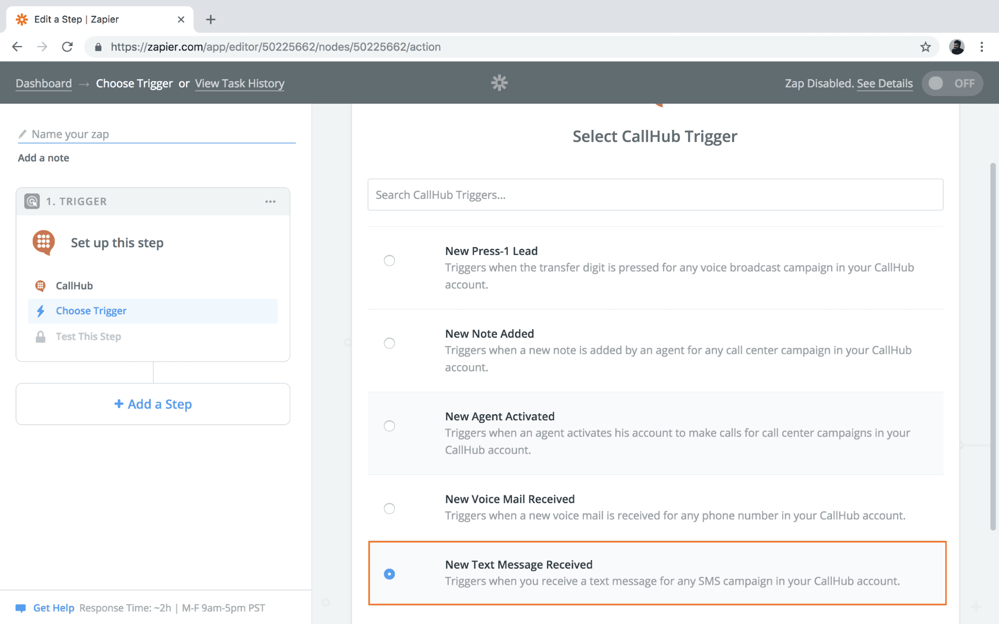 Choose CallHub as the trigger app and set the specific trigger the same as earlier – ‘New Text Message Received’.