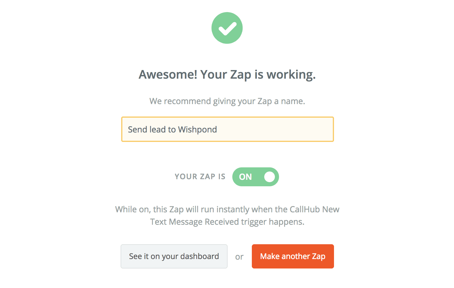 Click on ‘Make another Zap’ to start with your second automation that will add leads captured through your Text to Join campaign into a specific list in Wishpond.