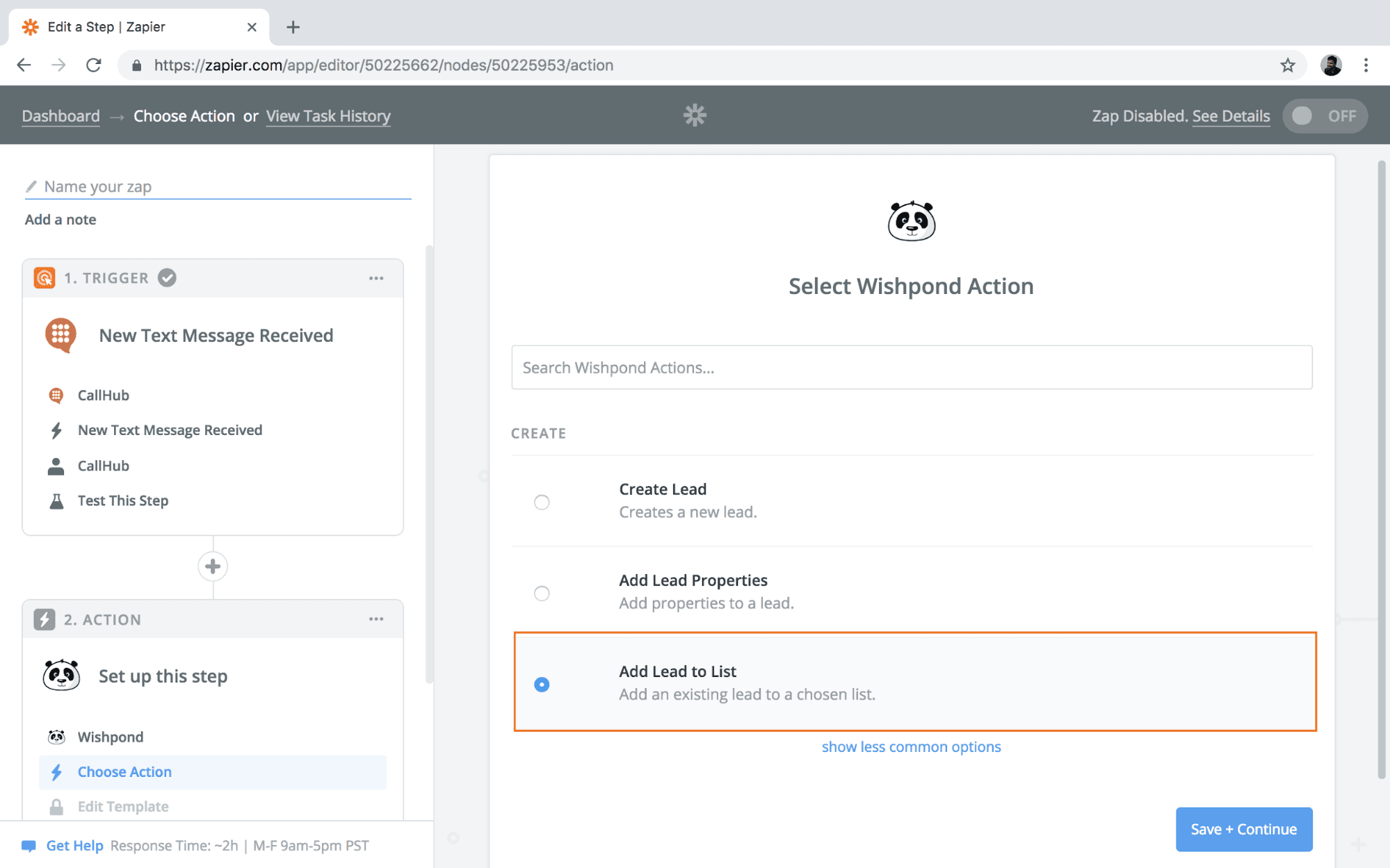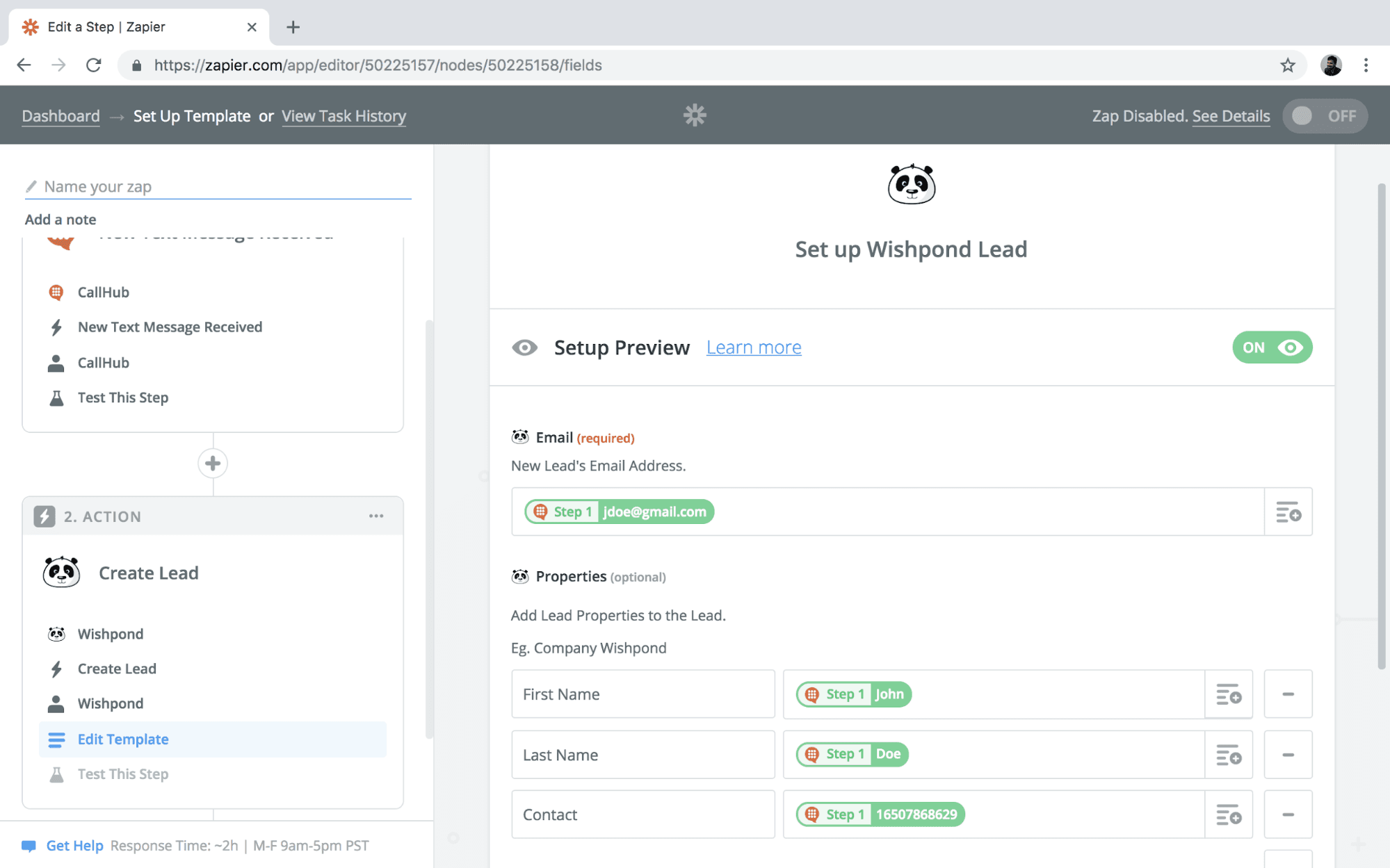 Create a new Zap that creates a lead in Wishpond when a new text message is received in CallHub.