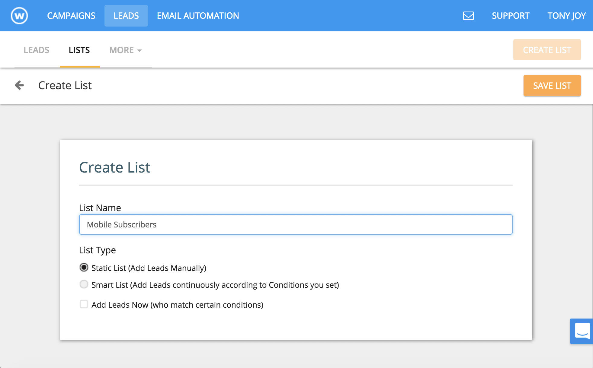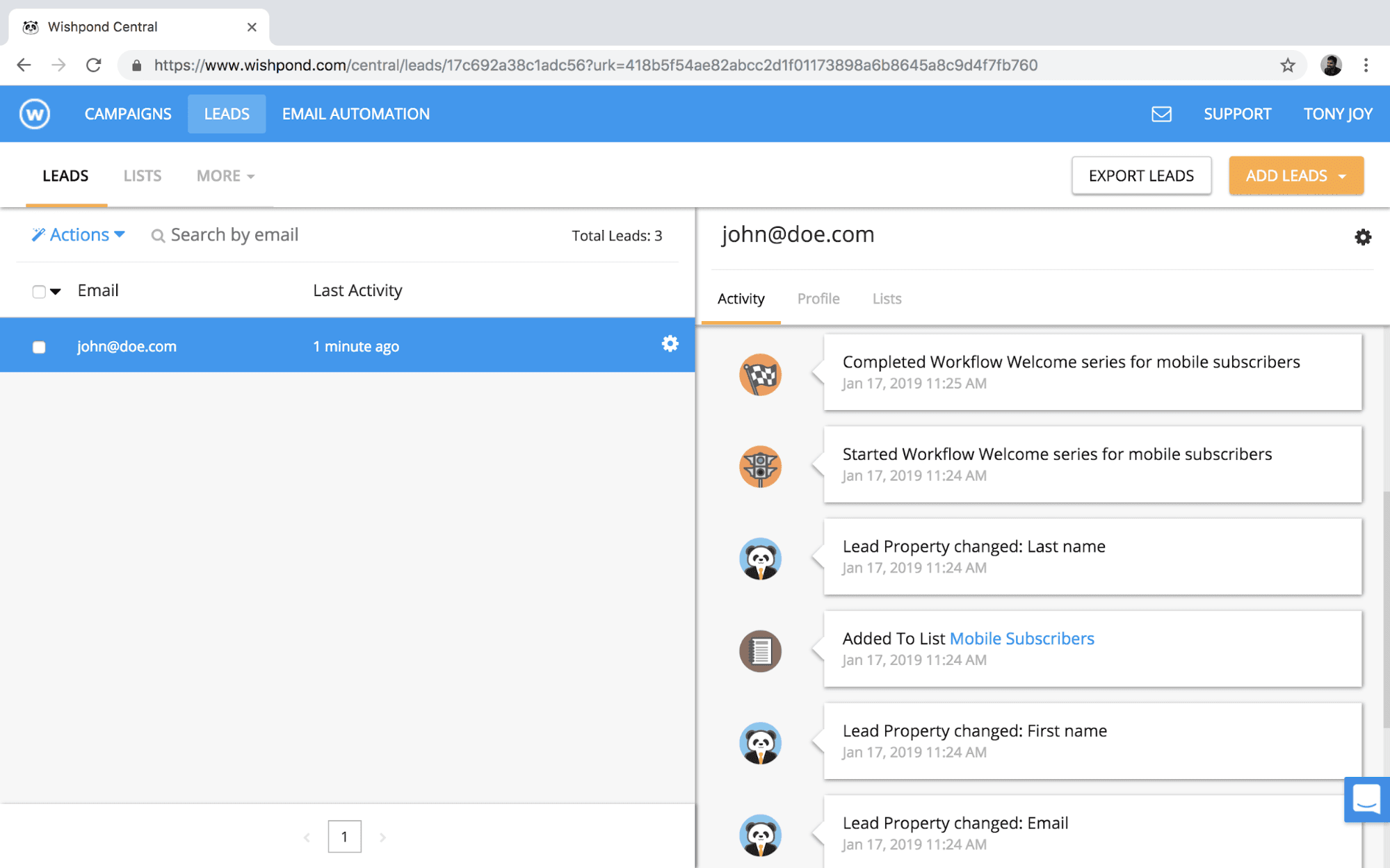 All leads subscribing to you through text will now be automatically added to the ‘Mobile Subscribers’ list and get started on a lead nurturing campaign on Wishpond as you can see in the image below.