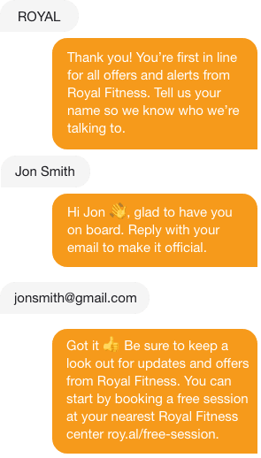 Another way to let people join your list is to run a text to join campaign using tools like CallHub. You display your number on any form of outreach like email, direct mail, social media or at events, and let people text you to join your list and receive offers and updates. For example, you can display a message saying “Text ROYAL to 565656 to be the first to receive offers and alerts from Royal Fitness.” which would capture lead details in the way of an automatic conversation.