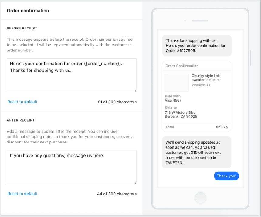 - Upselling: Right after a customer buys, they are 33% more likely to make a purchase again. This is a prime time to have a chatbot engage with the customer. Shopify and Facebook Messenger have an existing integration that allows store owners to provide anything from order confirmation messages to products related to what the customer just purchased.