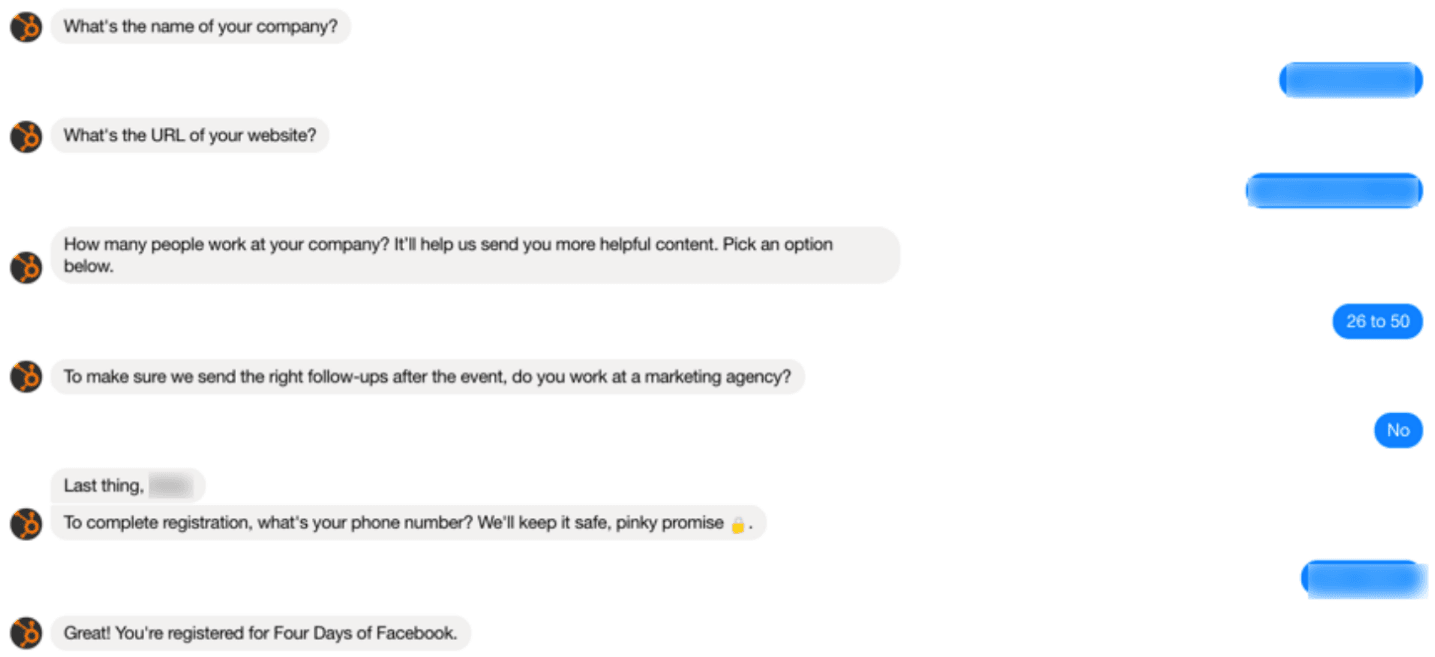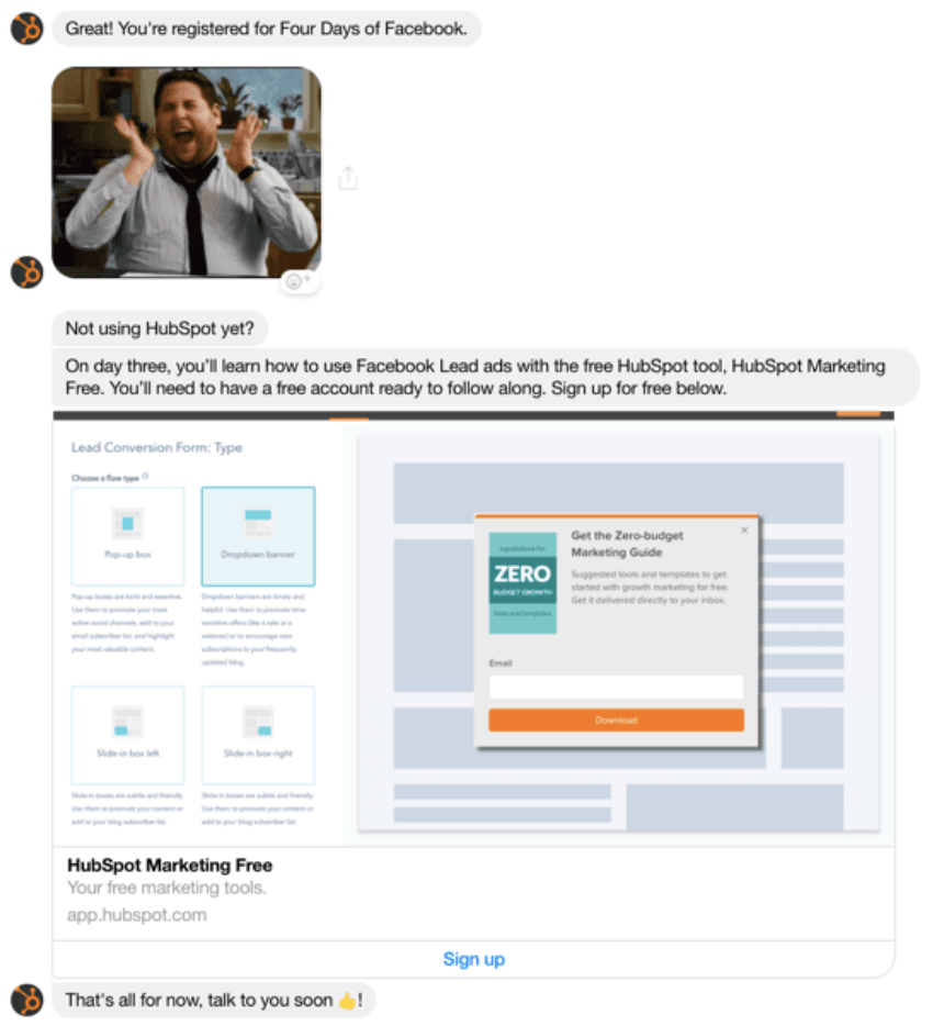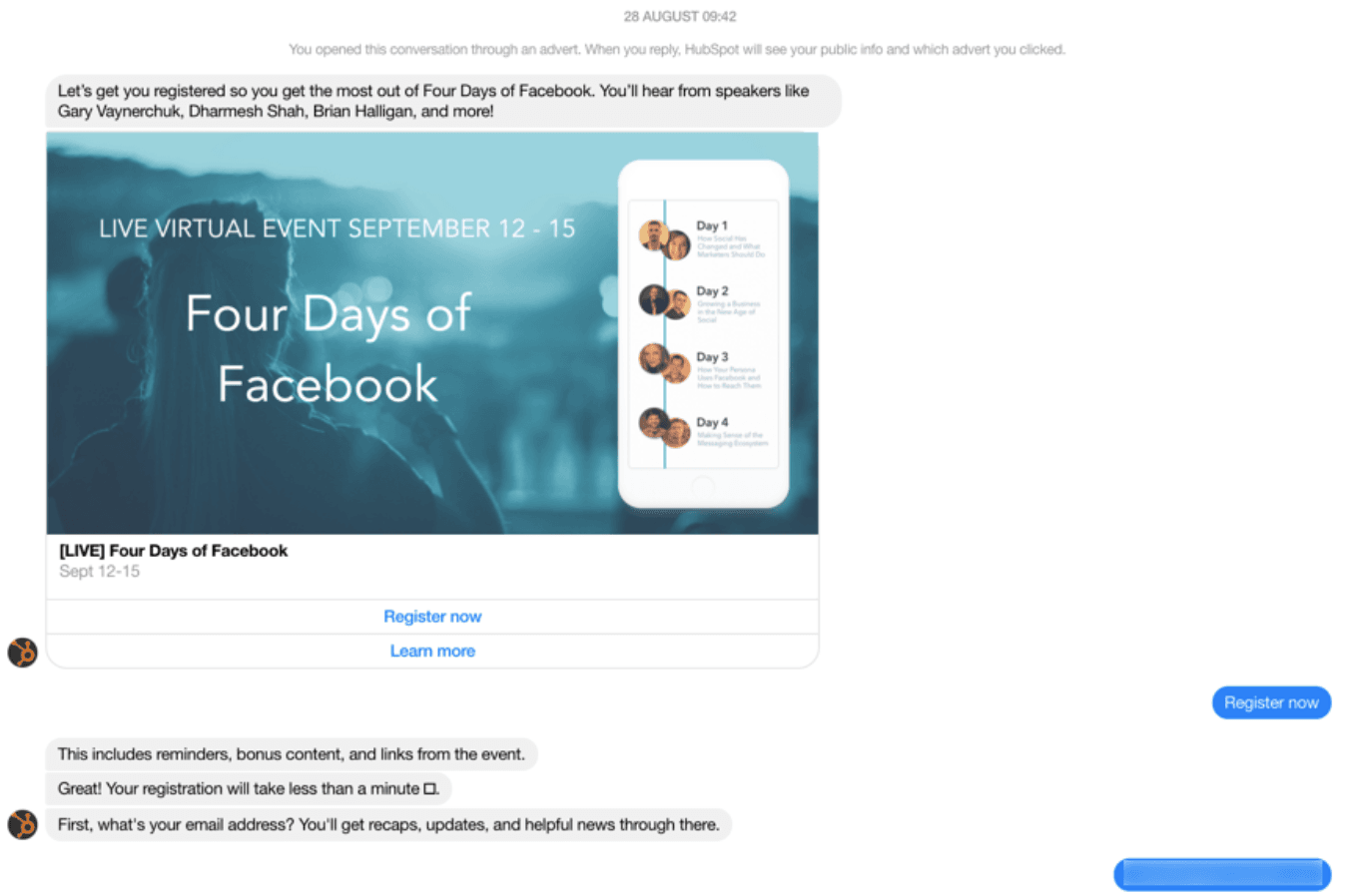 This is a highly effective strategy where brands can run Facebook ads to their targeted audiences, but instead of the click-through fall-off that occurs between webpage transition, ManyChat Messenger Bot engages with the user natively in Facebook to sign them up for a webinar. This seamless experience dramatically increases conversions and decreases CPA.