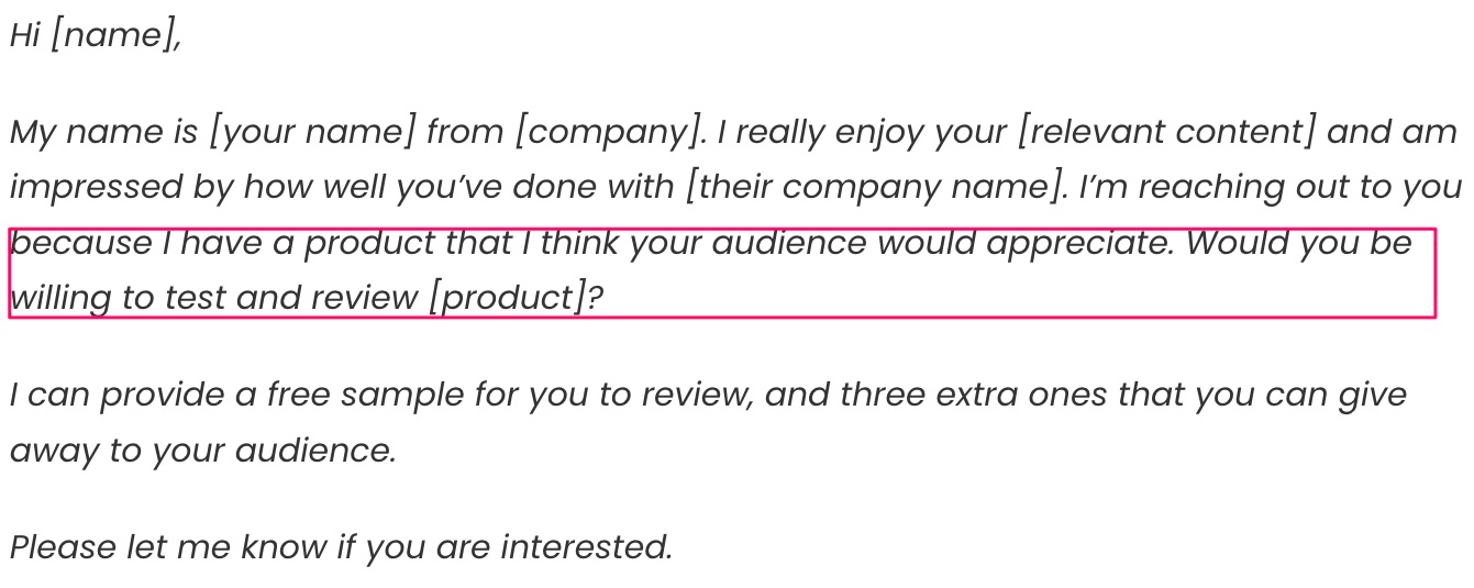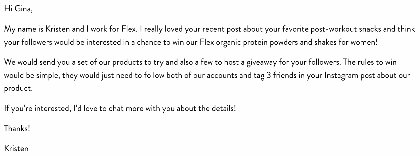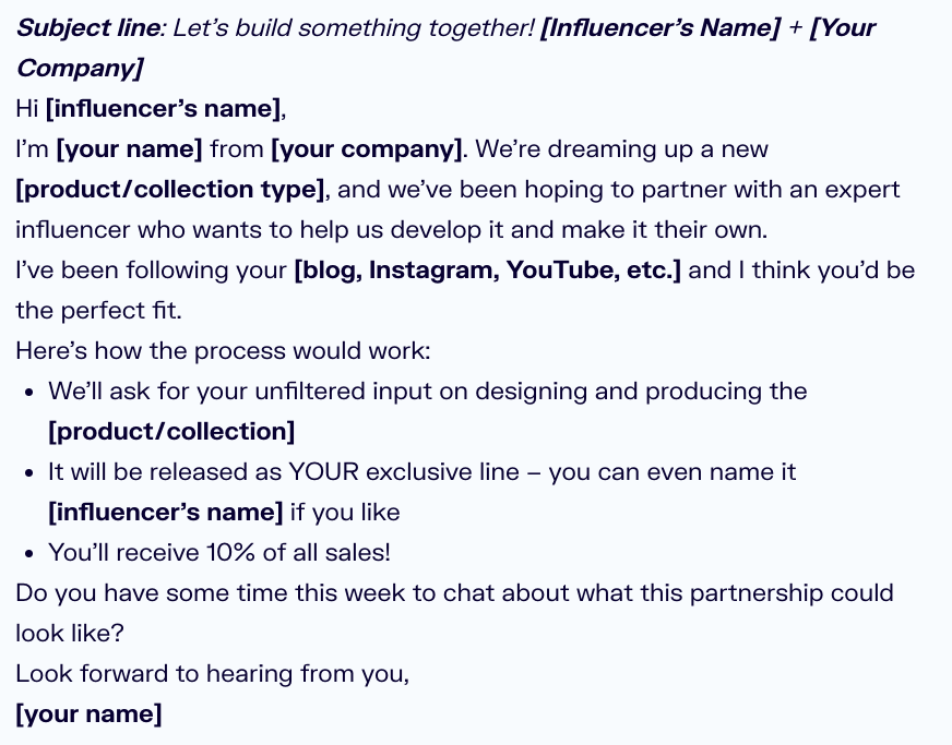 Start your email with a compliment or common interest. A few seconds of research on each influencer will yield great results. Here’s a great example of a personalized outreach email template.