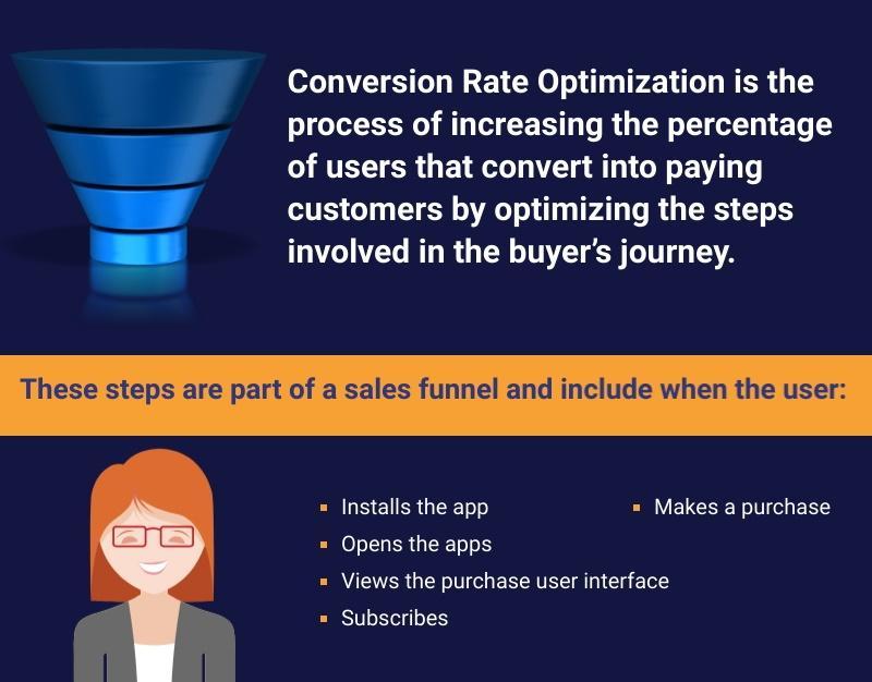 It is the process of increasing the percentage of users that convert into paying customers by optimizing the steps involved in the buyer’s journey. These steps are part of a sales funnel and include when the user: