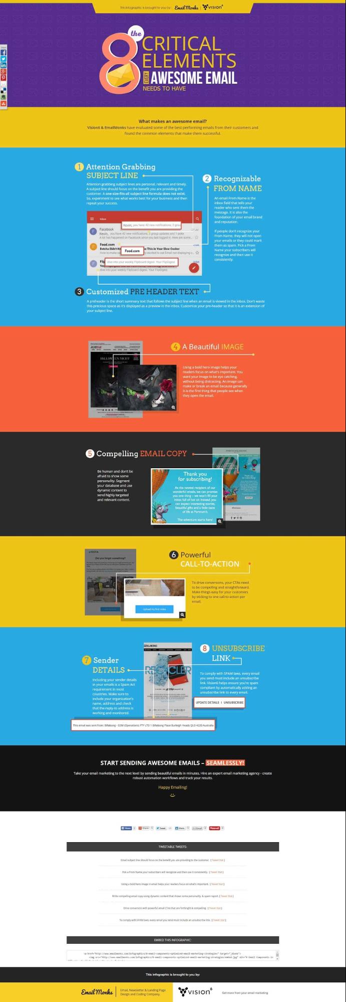 If your email open rates are lesser than the industry average, you need to take a closer look at the emails you are sending. According to this infographic, an email’s subject line, preheader text, copy, graphics, and CTA among others are the critical elements of an effective email. So, if these elements are not optimized, there’s a poor chance of your email generating the desired results.
