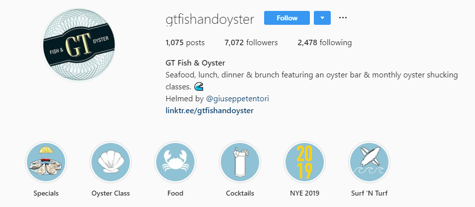 Check out how GT Fish & Oyster categories their Instagram stories.