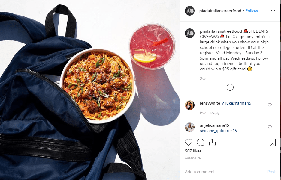 For a back to school special for college and high school students, Piada used a school bag and savory food bowl to show off their fun side and flavorful dishes.