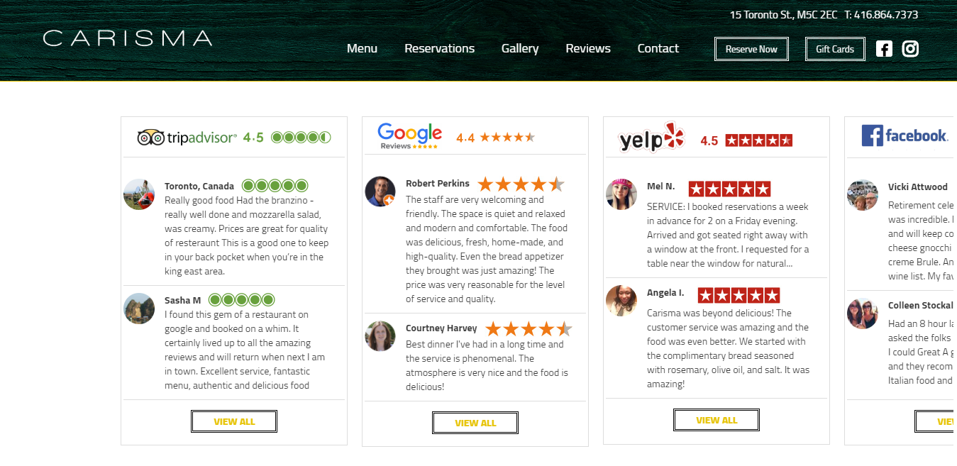 - Display your customer testimonials and reviews on your website. Carisma’s website uses social media widgets to share reviews in real-time.
