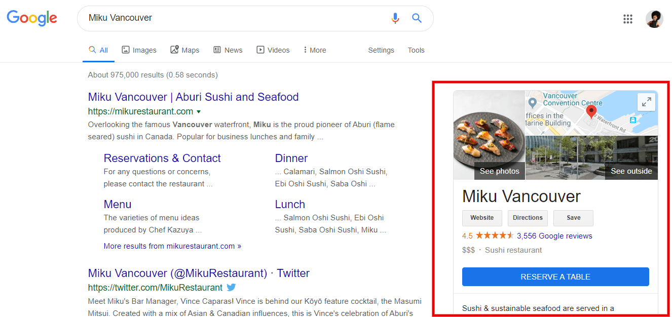A Google My Business account allows you to create a profile where you can add your contact details, reviews, images, and directions to your website. When people search for your restaurant by name, they can easily access information below on the right-hand side like the images below: