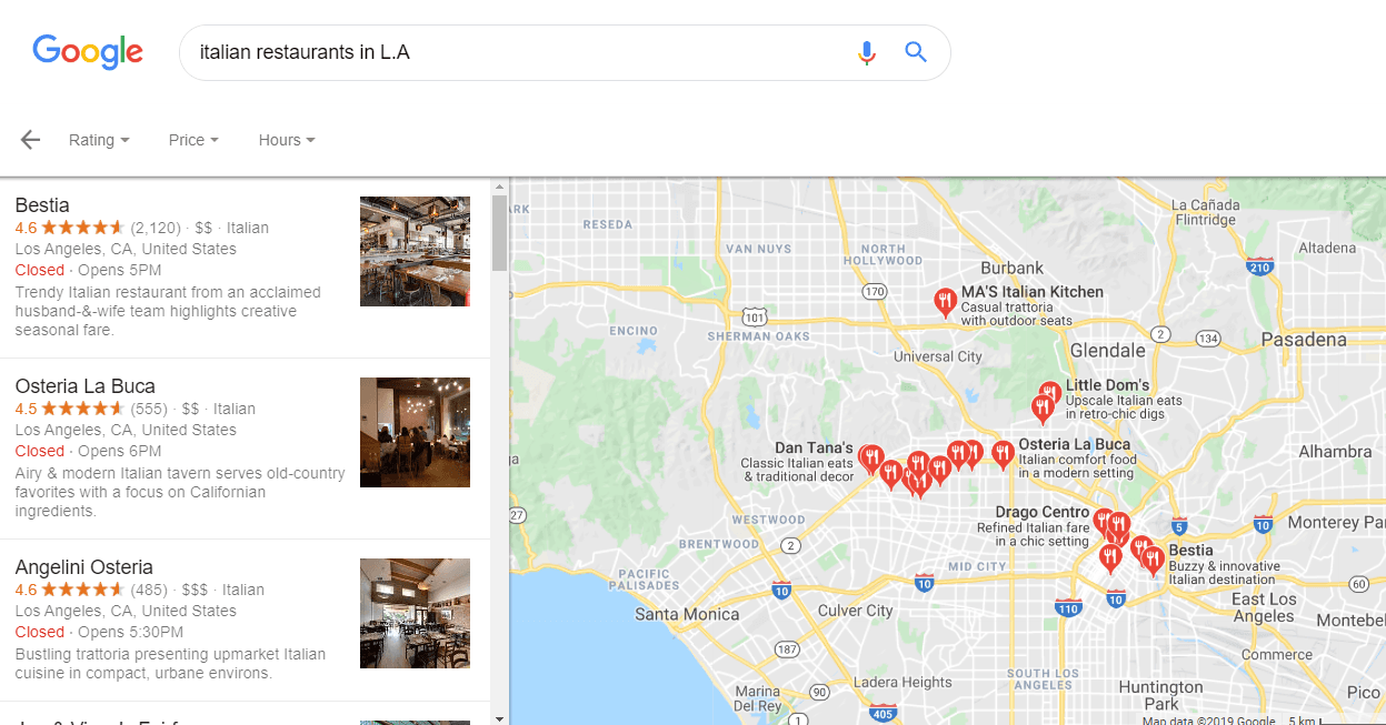 For example, if someone is searching for an Italian restaurant in L.A, they’ll see a list of restaurants listed on Google My Business.