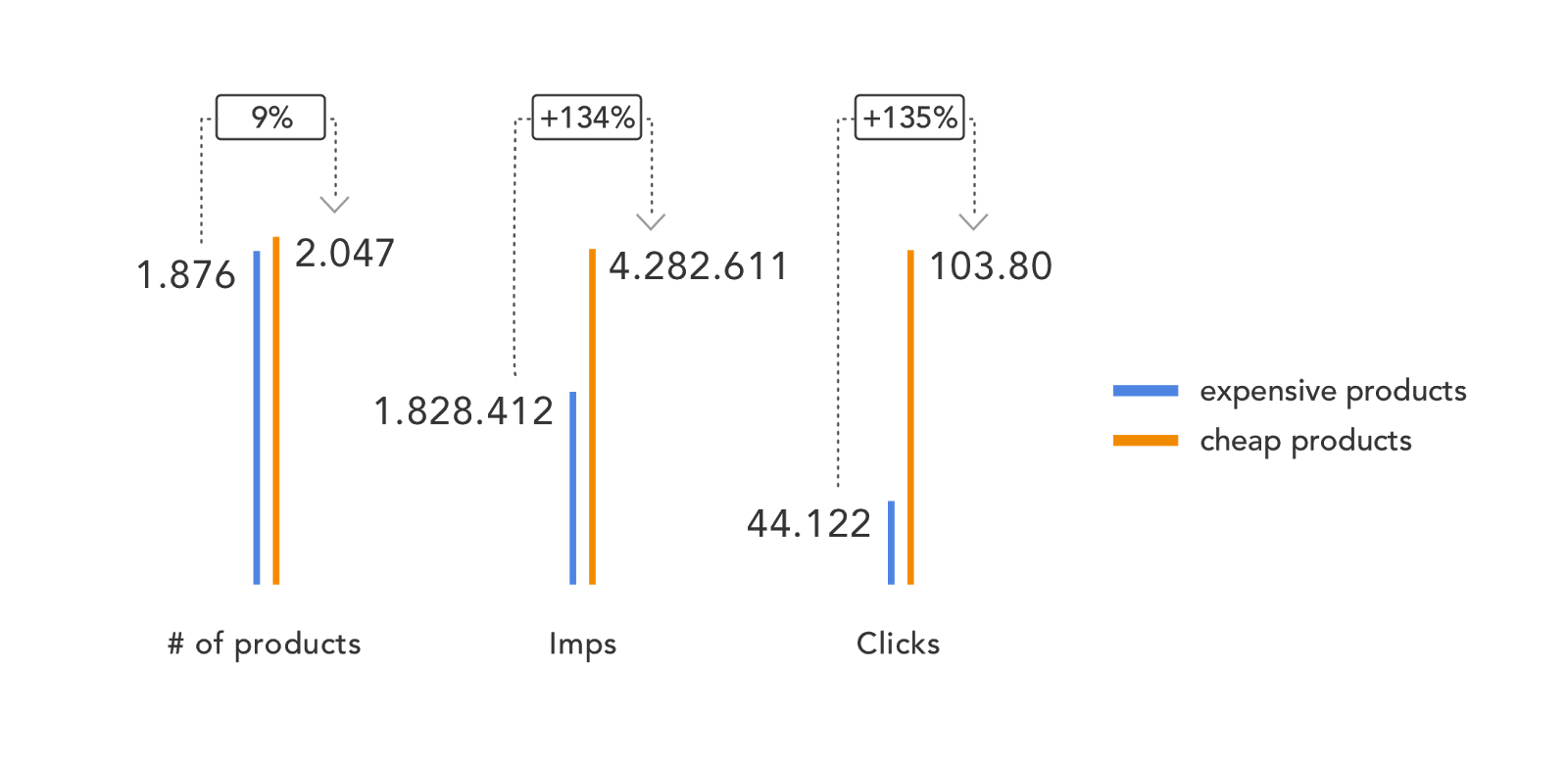 In a Search Engine Land study, they found that Google penalizes selling price increases and that you can’t fix below-optimal pricing with bidding strategies. In another study, they found that cheaper products in one store got 134% more impressions than expensive products in the store.