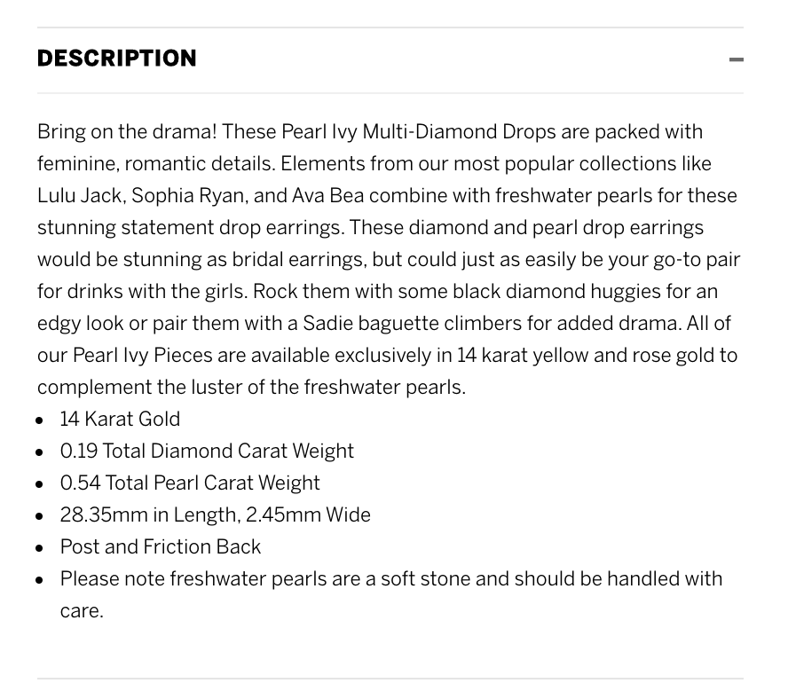 First it paints the picture “These diamond and pearl drop earrings would be stunning as bridal earrings, but could just as easily be your go-to pair for drinks with the girls.”