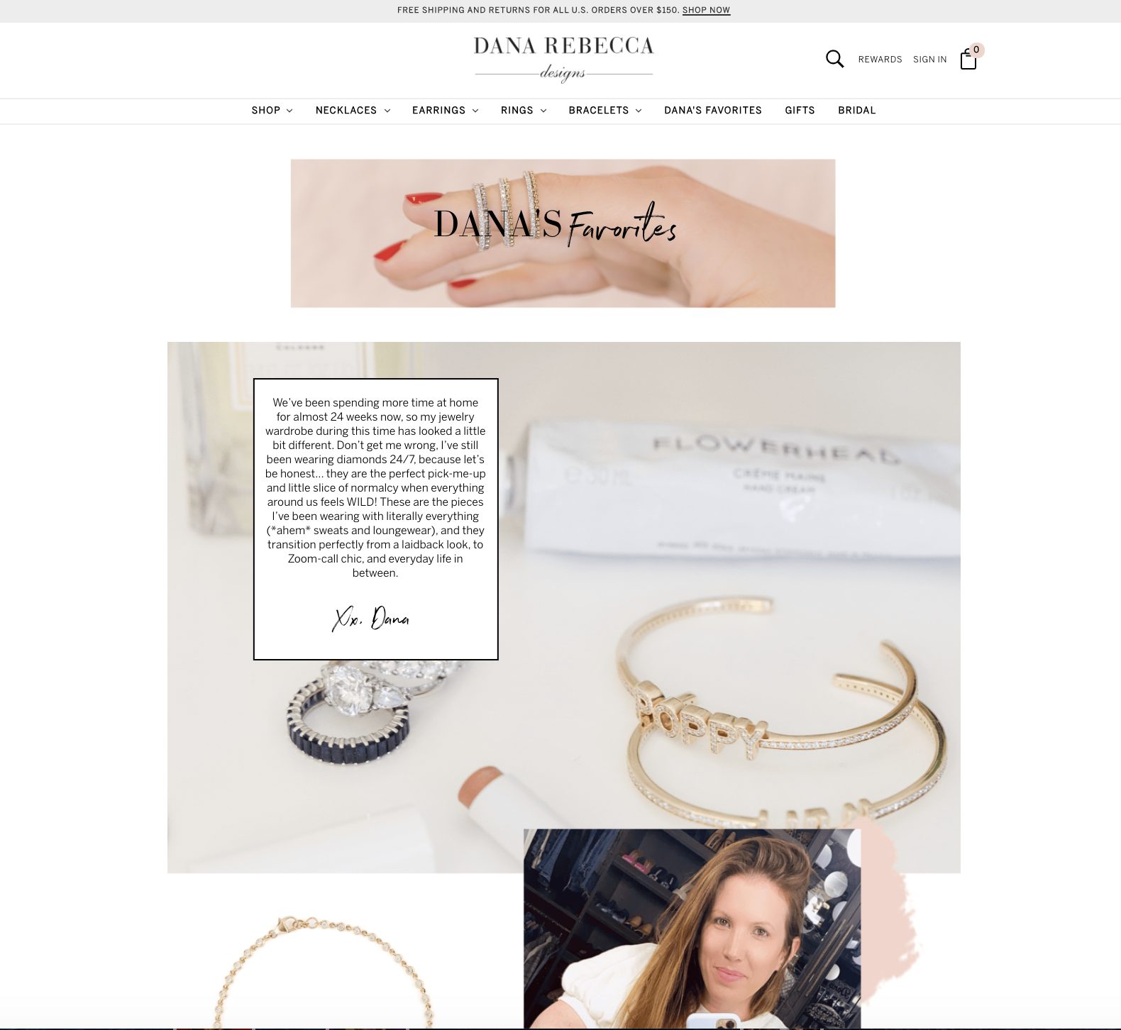 You should also look at how different brands use marketing content and blogs to engage customers. Dana Rebecca Designs, for example, spotlights products with a category called Dana’s Favorites that features the company’s founder.