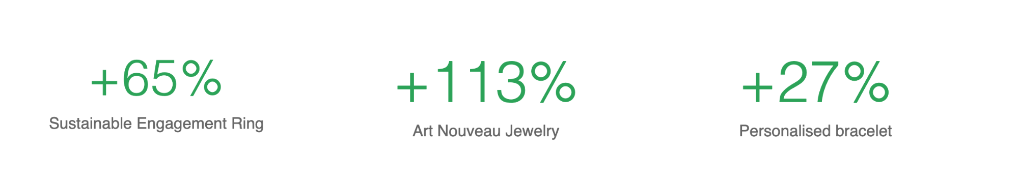 - Sustainable and ethical jewelry piques consumer interest. According to the ExJewel report, searches for “ethical jewelry” or “ethical diamond” grew by 75% YoY. Interest in “lab grown diamond” increased by 83%. Eco-conscious consumers are also looking for “ethical gold” 73% more frequently since the start of 2020.