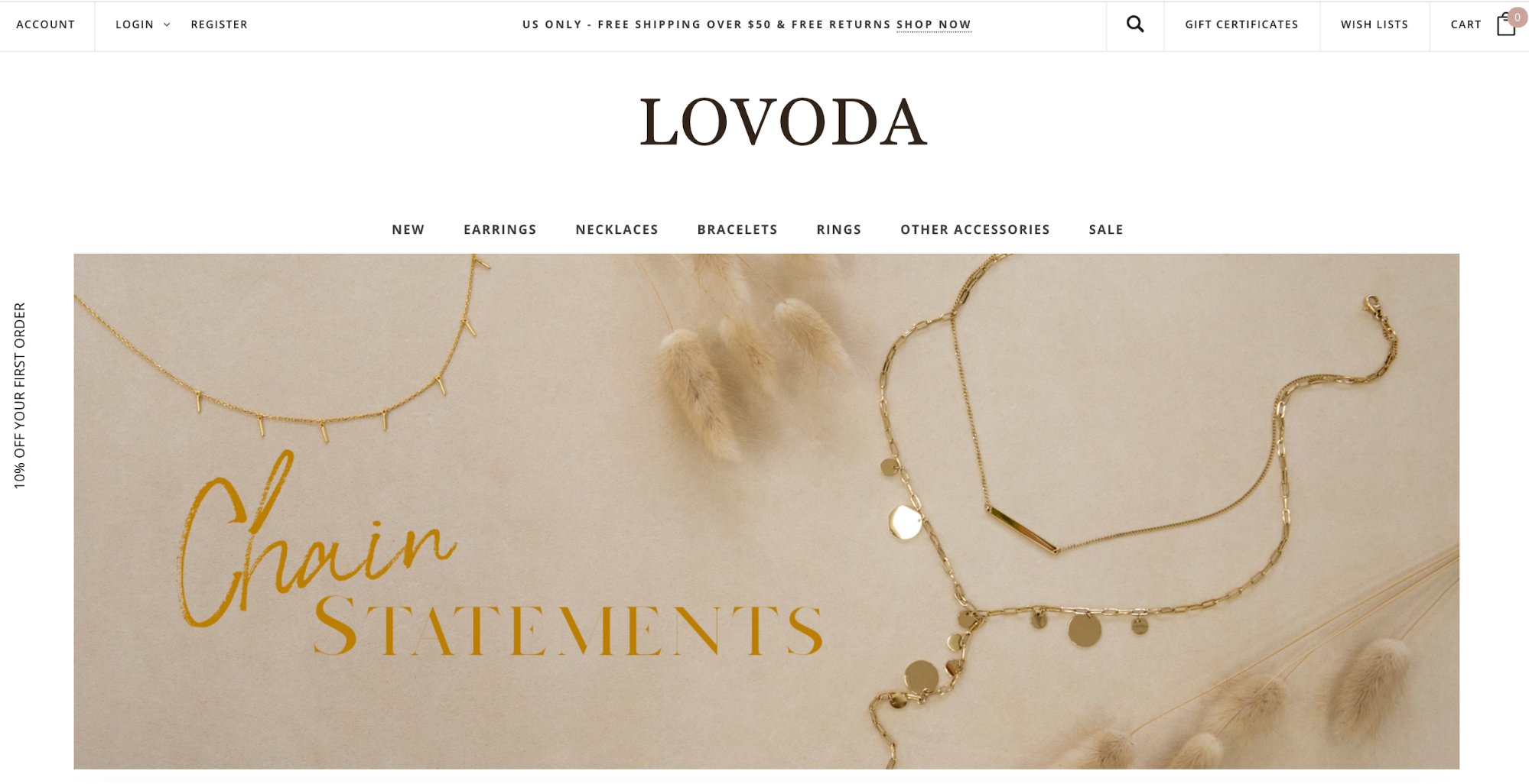 Lovoda categorizes products by jewelry type: earrings, necklaces, bracelets, and rings. There’s also a category for new products, and a sale category targets those interested in snagging a deal.