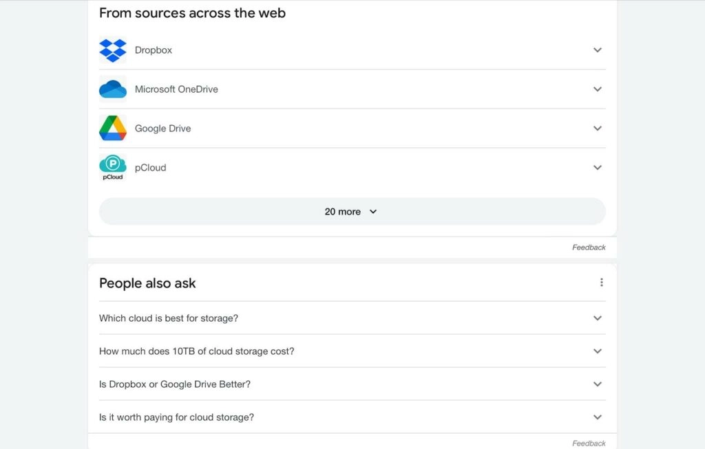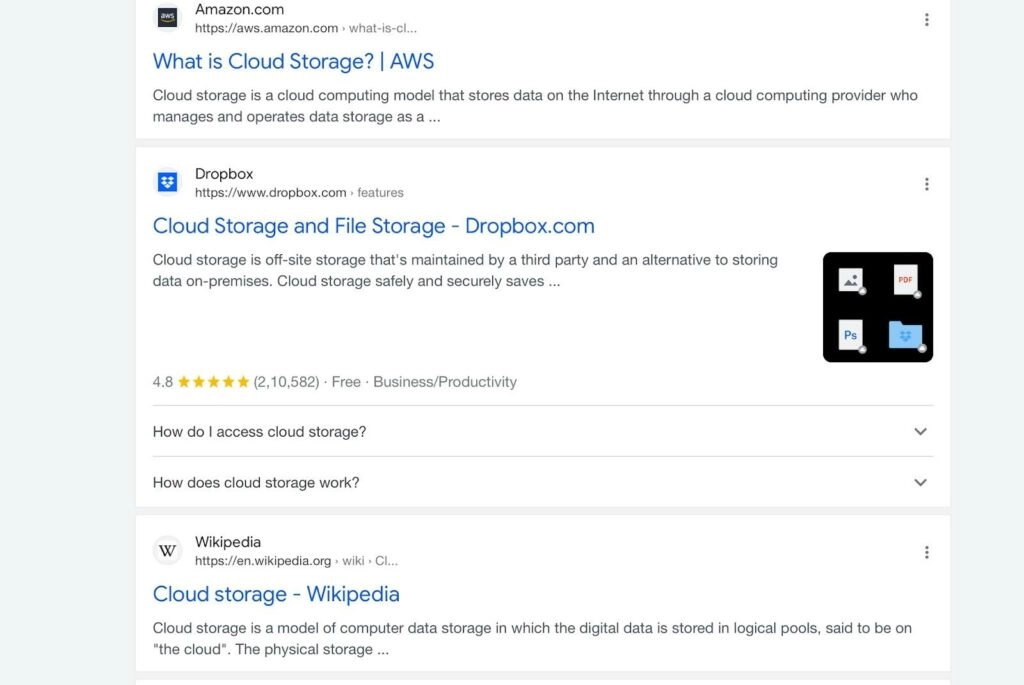 Usually, people search for something because they intend to buy, learn, or find it. Thus, when we search for “cloud storage,” Google gave us generic results like what cloud storage is, how it works, etc.