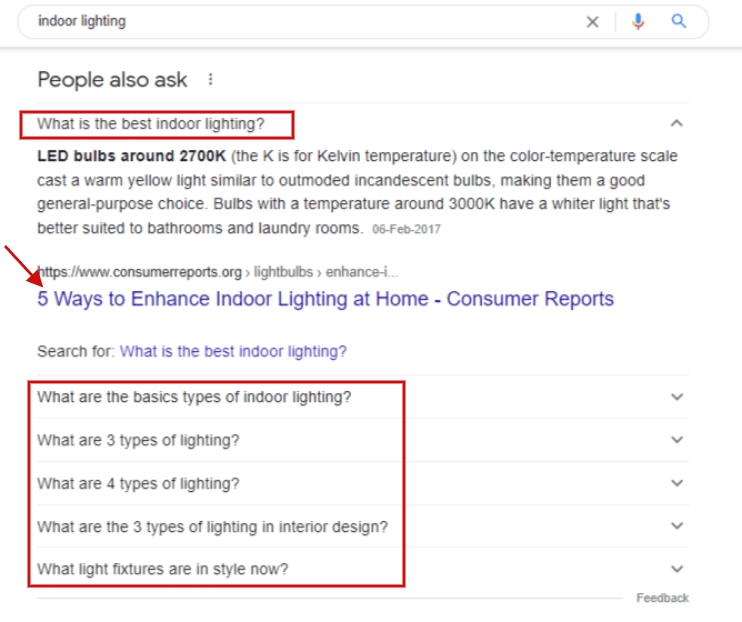 For example, if a person wants to learn about “indoor lighting,” Google also answers questions like: