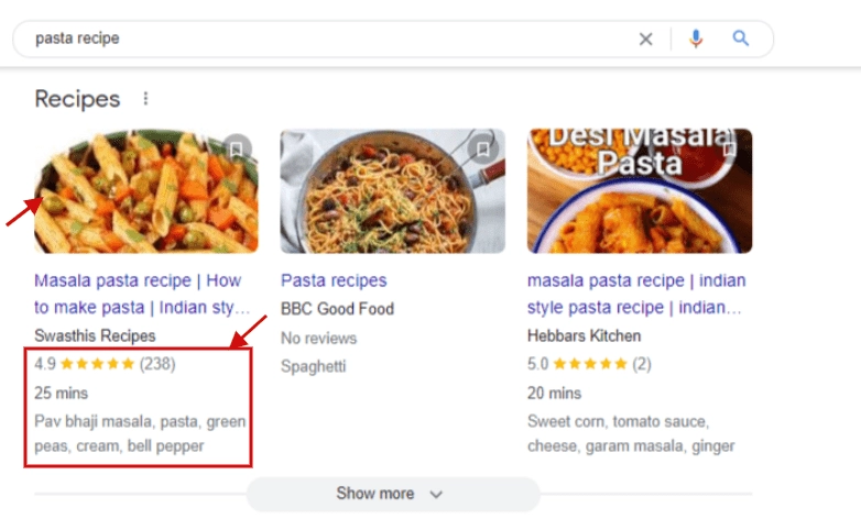These are known as “Rich results or Rich snippets.” They feature information like photos, user ratings, preparation time, and the ingredients you’ll need.