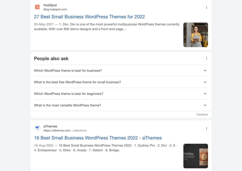 Let’s say you searched for the “best WordPress themes for small businesses” on Google. You will not only get results for the searched keyword but also for related questions that might interest you. For example: