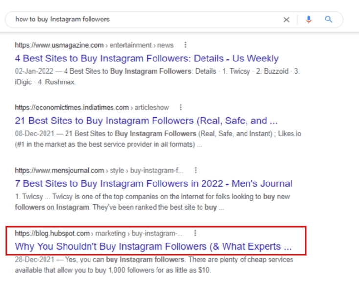 While the highlighted HubSpot post doesn’t exactly address the keyword, it covers something that users need to know before they decide to buy Instagram followers. In addition, it also includes advice from experts.