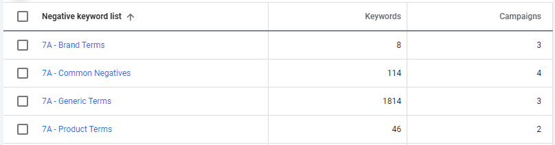 - Funnel your searches: Create shared negative keyword lists (universal, brand, and SKU negatives) to drive higher-intent traffic to the appropriate campaign. As a rule, apply all the negative keyword lists to your generic campaigns but make sure you only apply the universal keyword lists to your SKU campaigns.