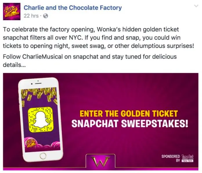 The Charlie and the Chocolate Factory Musical had a great opening night as they were able to attract many of their followers to enter their contest. The company had hidden golden ticket Snapchat geofilters all around New York City.