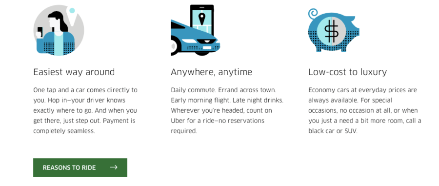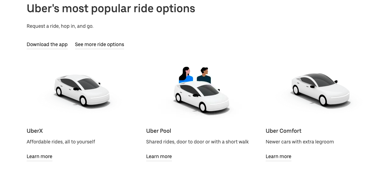 Even when you visit the Uber ride options page, everything is clearly displayed. Each rideshare option is accompanied by a graphic and a quick description. Compared to their competitors like Lyft that offer very similar services, Uber comes up on top because they know exactly what they are delivering to their customers and do not bother beating around the bush.
