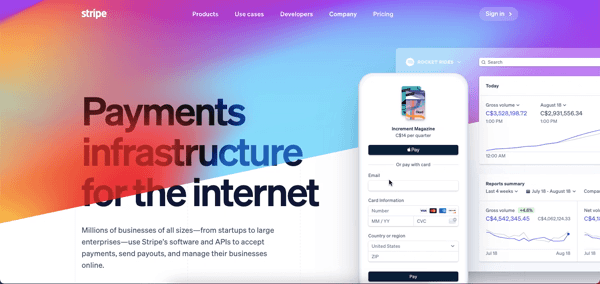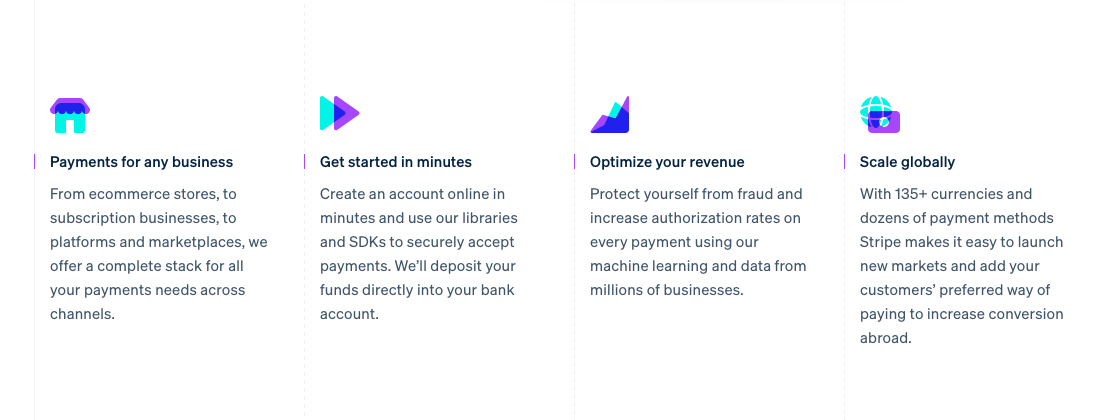 Once you keep moving down the page, you are met with relevant graphics and gifs that aid every word on your screen. A list of benefits such as easy-to-use APIS that show a developer Stripe is easy to work with or some of their impressive statistics such as the 135+ currencies and payment methods they support make you want to try Stripe out.
